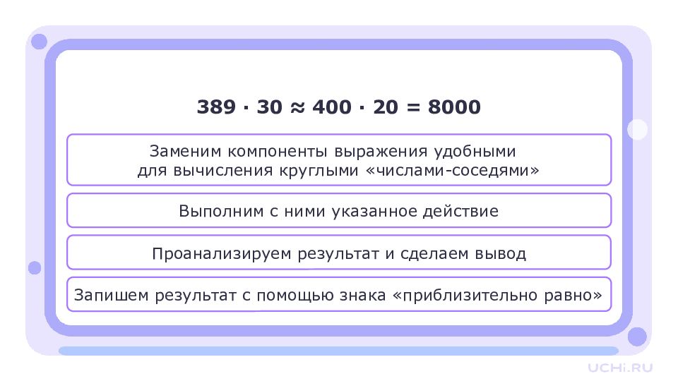 389 ∙ 30 ≈ 400 ∙ 20 = 8000 Проанализируем результат и сделаем вывод Запишем результат с помощью знака «приблизительно равно» Выполним с ними указанное действие Заменим компоненты выражения удобными для вычисления круглыми «числами-соседями»