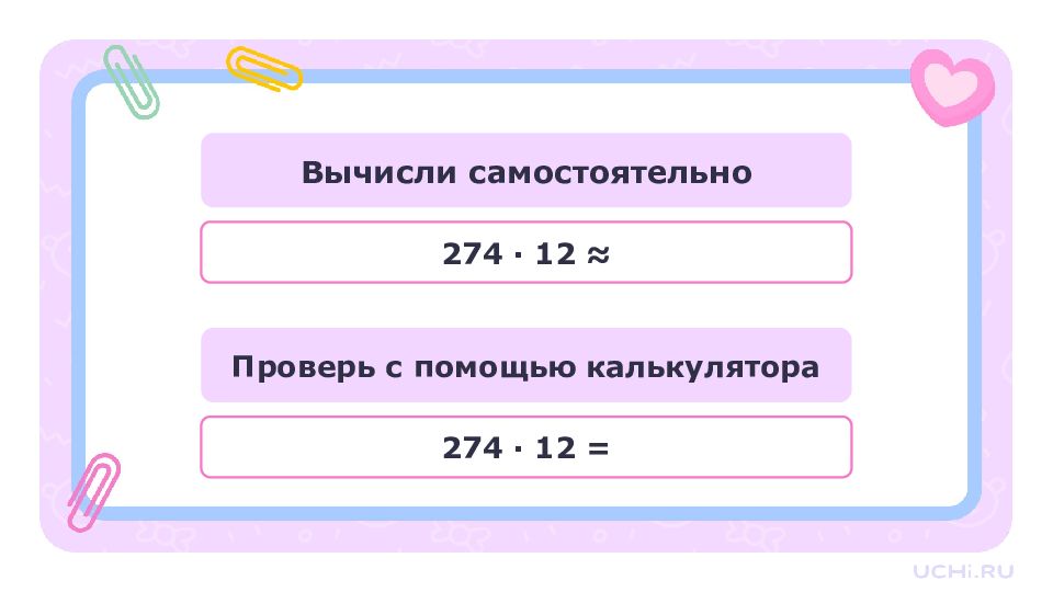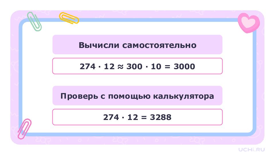 Вычисли самостоятельно Проверь с помощью калькулятора 274 ∙ 12 ≈ 274 ∙ 12 =