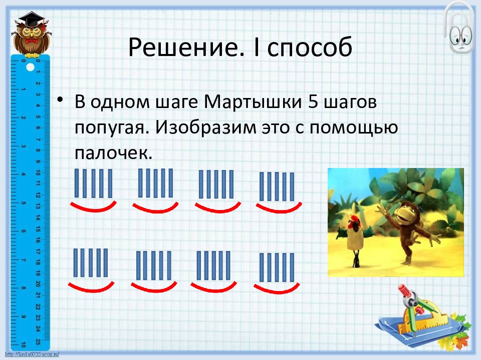 В одном шаге Мартышки 5 шагов попугая. Изобразим это с помощью палочек.