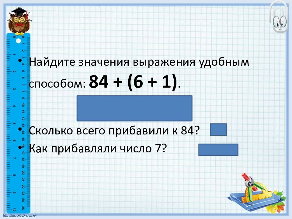 Найдите значения выражения удобным способом: 84 + (6 + 1). (84 + 6) + 1 Сколько всего прибавили к 84? 7 Как прибавляли число 7? 6 + 1