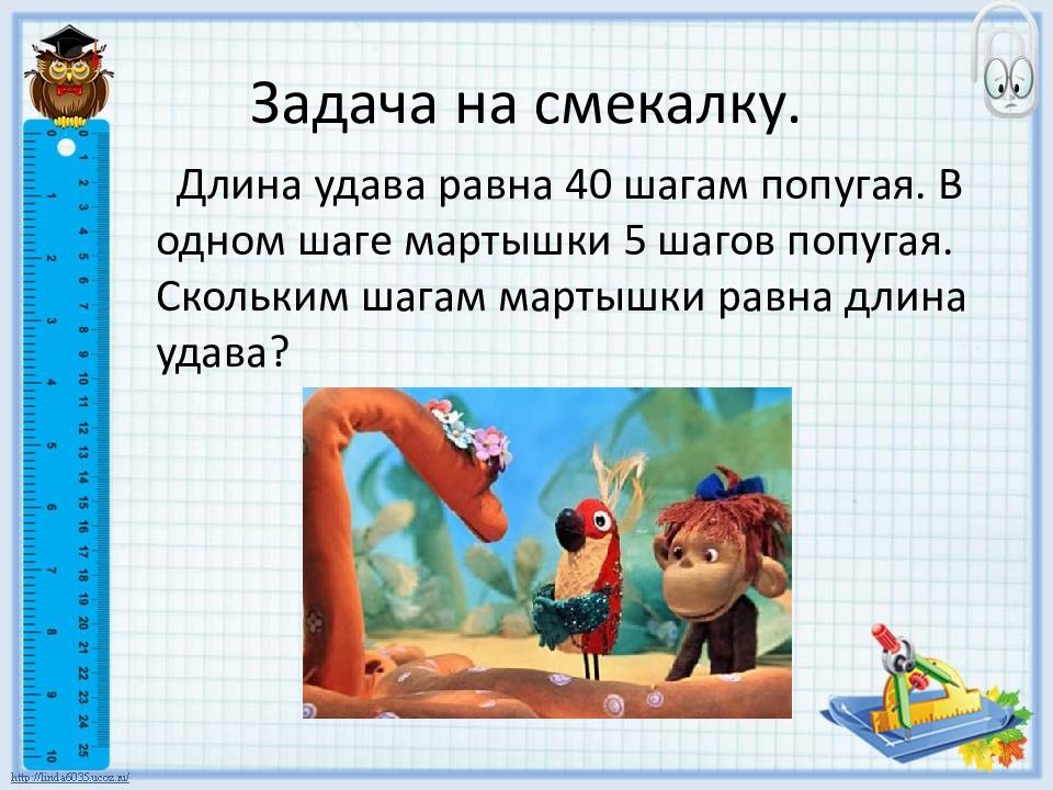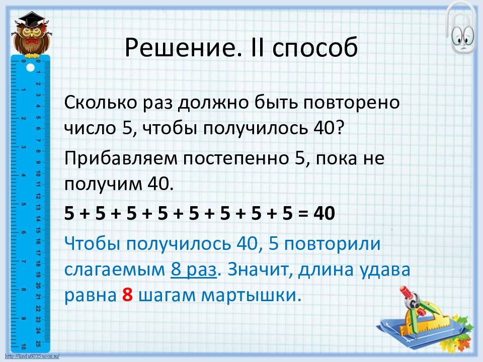 Сколько раз должно быть повторено число 5, чтобы получилось 40? Прибавляем постепенно 5, пока не получим 40. 5 + 5 + 5 + 5 + 5 + 5 + 5 + 5 = 40 Чтобы получилось 40, 5 повторили слагаемым 8 раз. Значит, длина удава равна 8 шагам мартышки.