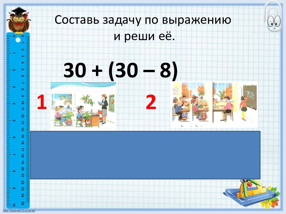 30 + (30 – 8) 1 2 В первом классе учится 30 человек, а во втором на 8 учеников меньше. Сколько всего учеников в двух классах?