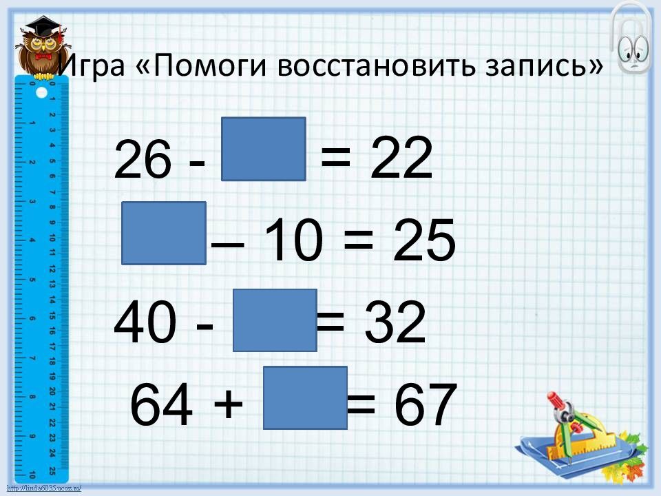 26 - 4 = 22 35 – 10 = 25 40 - 8 = 32 64 + 3 = 67