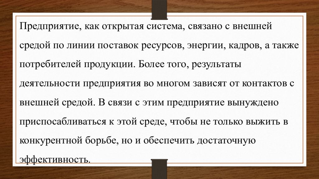Предприятие, как открытая система, связано с внешней средой по линии поставок ресурсов, энергии, кадров, а также потребителей продукции. Более того, результаты деятельности предприятия во многом зависят от контактов с внешней средой. В связи с этим предприятие вынуждено приспосабливаться к этой среде, чтобы не только выжить в конкурентной борьбе, но и обеспечить достаточную эффективность.