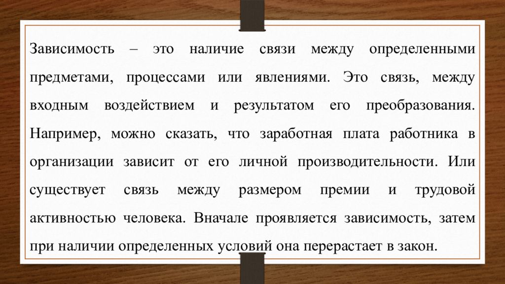 Зависимость – это наличие связи между определенными предметами, процессами или явлениями. Это связь, между входным воздействием и результатом его преобразования. Например, можно сказать, что заработная плата работника в организации зависит от его личной производительности. Или существует связь между размером премии и трудовой активностью человека. Вначале проявляется зависимость, затем при наличии определенных условий она перерастает в закон.