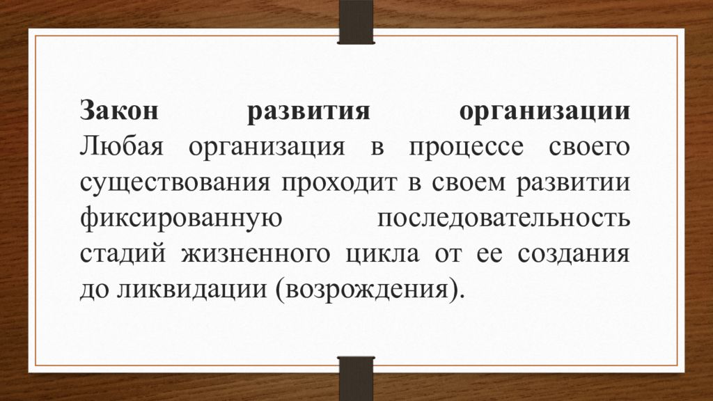 Закон онтогенеза (развития) — каждая организация проходит в своем развитии следующие фазы жизненного цикла: зарождение, рост, зрелость и угасание. Онтогенез — это последовательность преобразований, претерпеваемых организацией от зарождения до конца жизни.