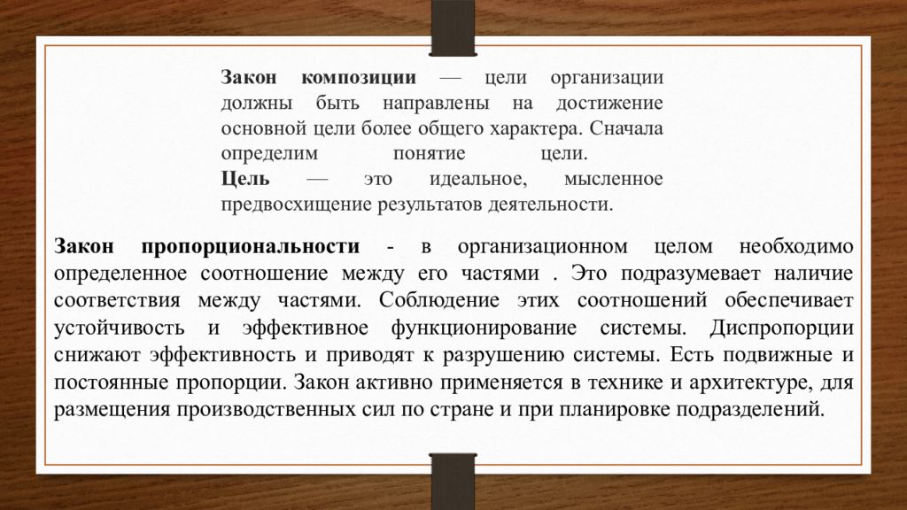 Закон пропорциональности - в организационном целом необходимо определенное соотношение между его частями. Это подразумевает наличие соответствия между частями. Соблюдение этих соотношений обеспечивает устойчивость и эффективное функционирование системы. Диспропорции снижают эффективность и приводят к разрушению системы. Есть подвижные и постоянные пропорции. Закон активно применяется в технике и архитектуре, для размещения производственных сил по стране и при планировке подразделений.
