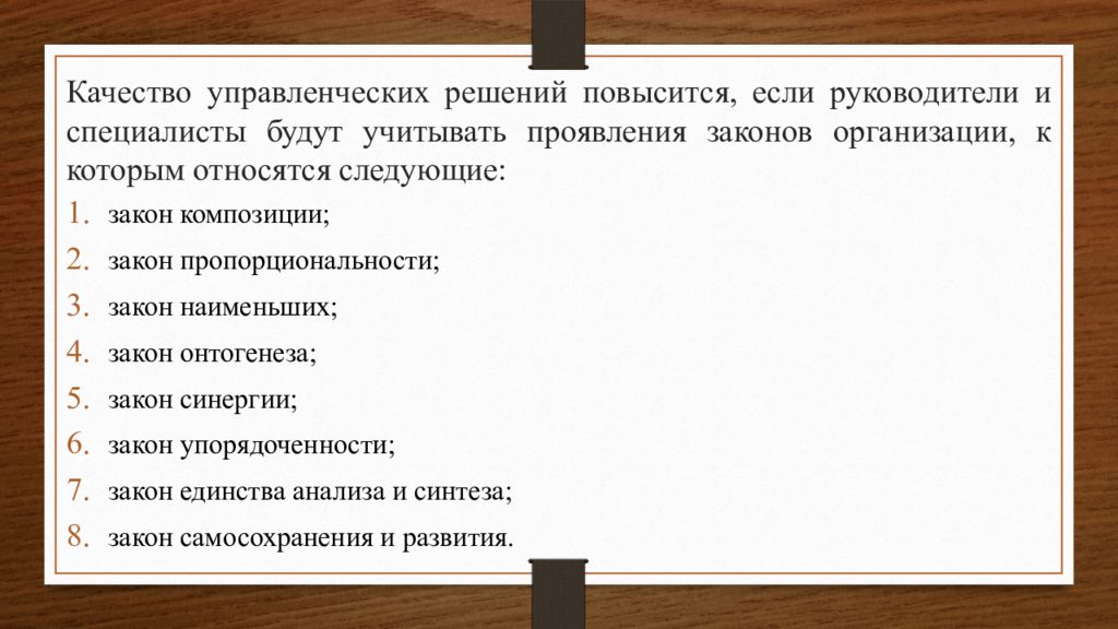 Слайд 7: Качество управленческих решений повысится, если руководители и специалисты будут учитывать проявления законов организации, к которым относятся следующие: