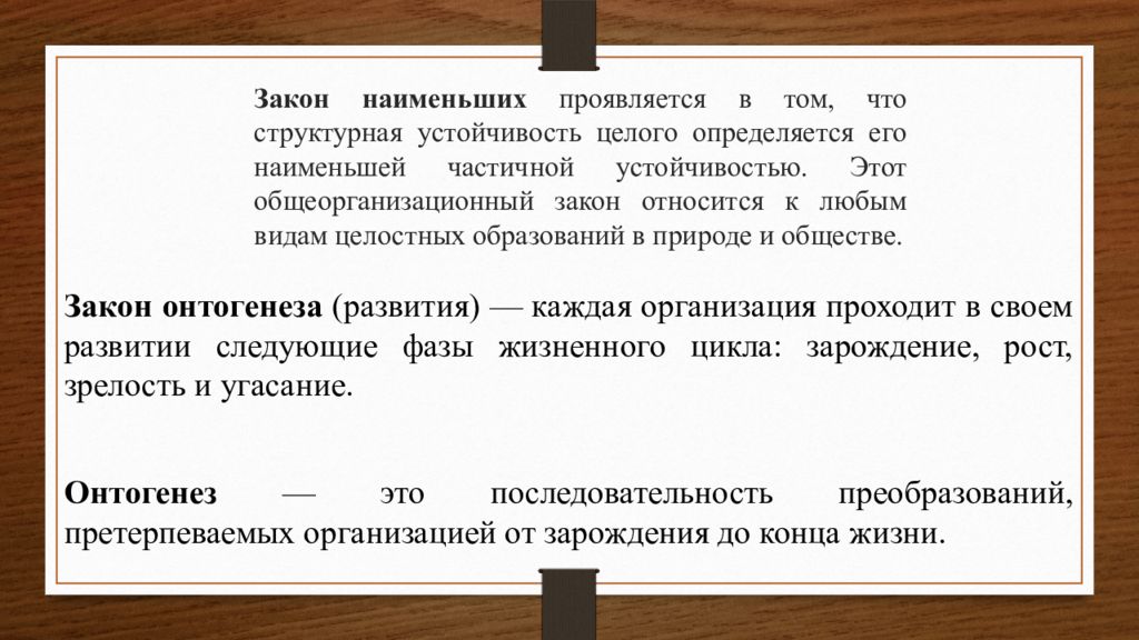 Слайд 9: Закон наименьших проявляется в том, что структурная устойчивость целого определяется его наименьшей частичной устойчивостью. Этот общеорганизационный закон относится к любым видам целостных образований в природе и обществе