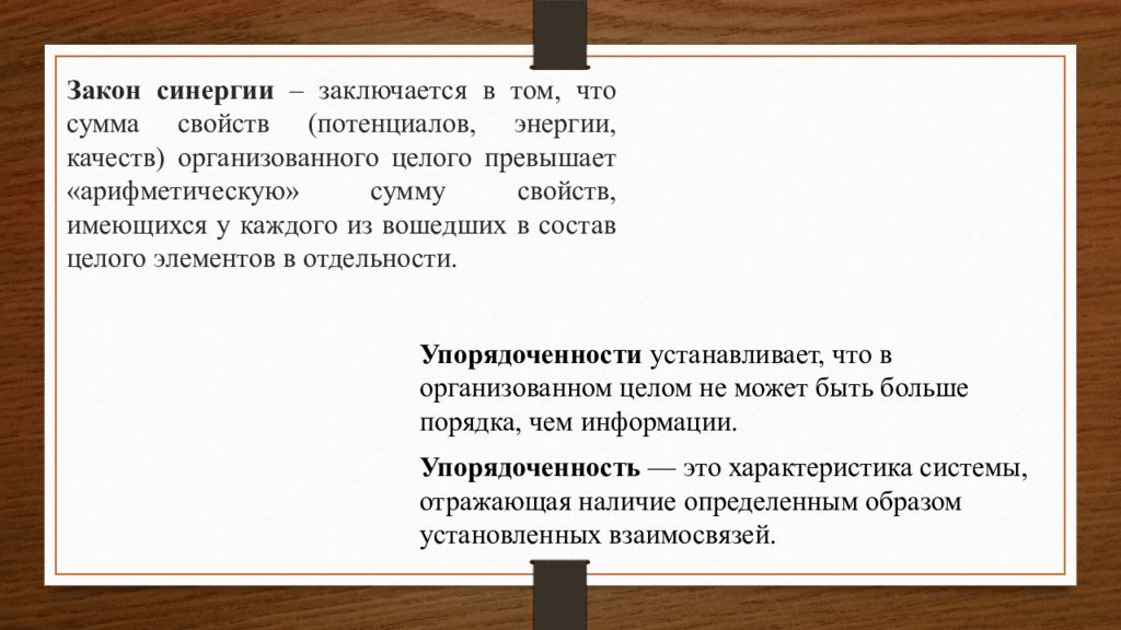 Слайд 10: Закон синергии – заключается в том, что сумма свойств (потенциалов, энергии, качеств) организованного целого превышает «арифметическую» сумму свойств, имеющихся у каждого из вошедших в состав целого элементов в отдельности