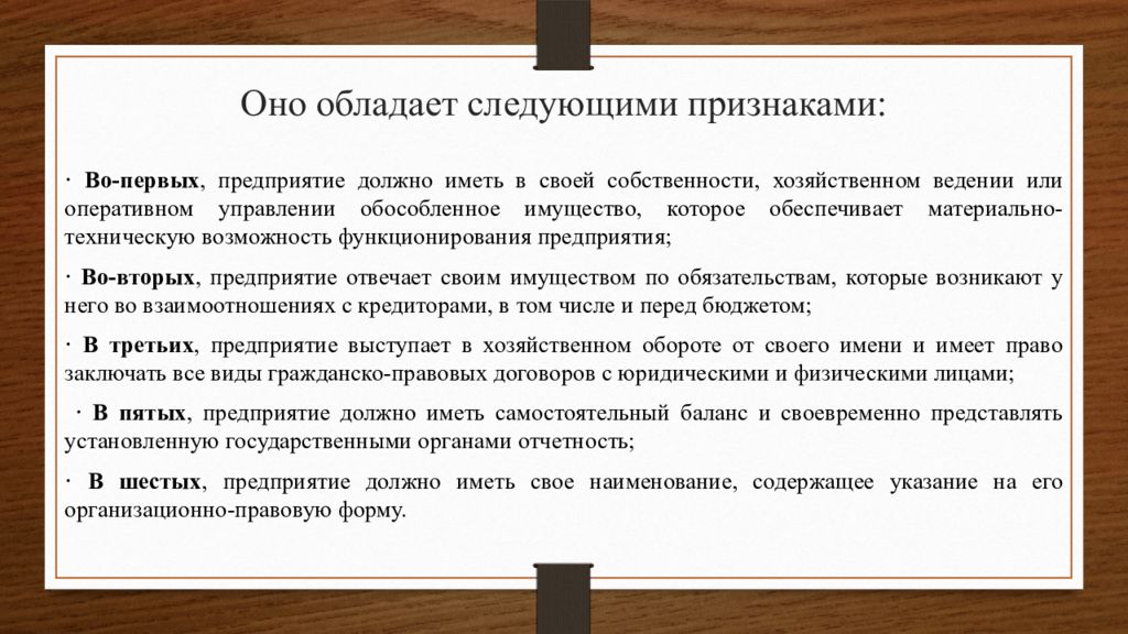 · Во-первых, предприятие должно иметь в своей собственности, хозяйственном ведении или оперативном управлении обособленное имущество, которое обеспечивает материально-техническую возможность функционирования предприятия ; · Во-вторых, предприятие отвечает своим имуществом по обязательствам, которые возникают у него во взаимоотношениях с кредиторами, в том числе и перед бюджетом ; · В третьих, предприятие выступает в хозяйственном обороте от своего имени и имеет право заключать все виды гражданско-правовых договоров с юридическими и физическими лицами ; · В пятых, предприятие должно иметь самостоятельный баланс и своевременно представлять установленную государственными органами отчетность ; · В шестых, предприятие должно иметь свое наименование, содержащее указание на его организационно-правовую форму.