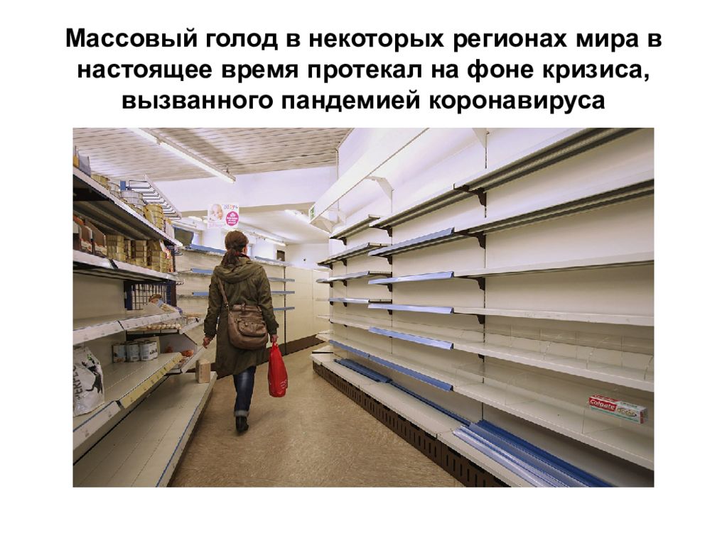 Слайд 6: Массовый голод в некоторых регионах мира в настоящее время протекал на фоне кризиса, вызванного пандемией коронавируса