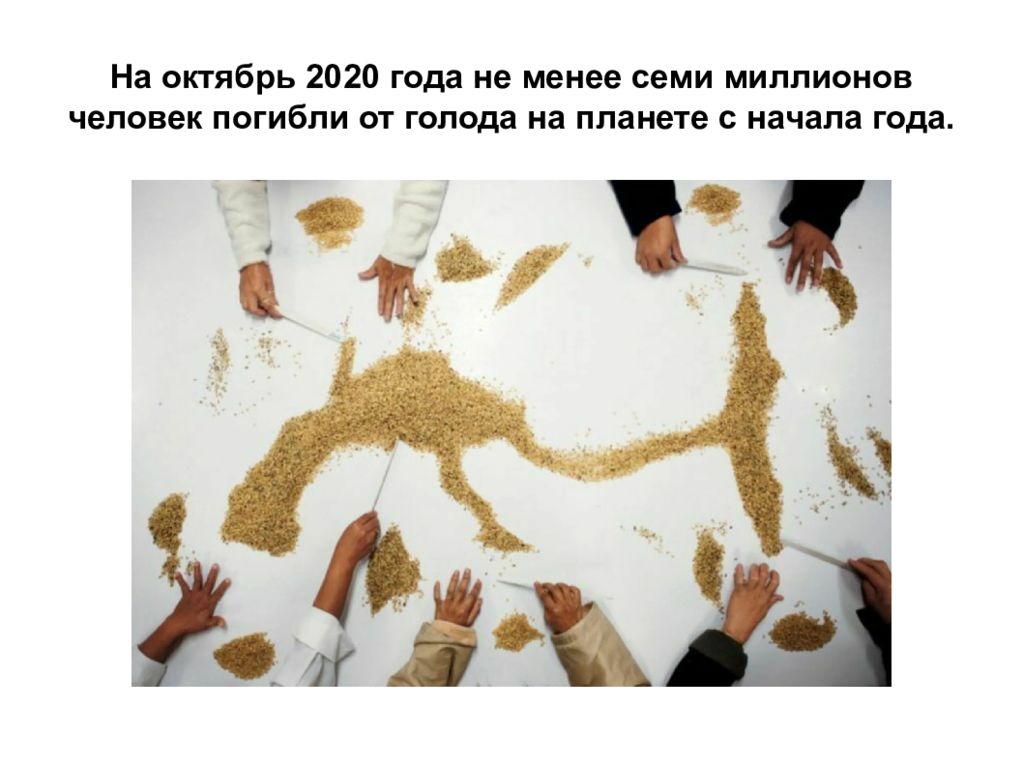 Слайд 13: На октябрь 2020 года не менее семи миллионов человек погибли от голода на планете с начала года