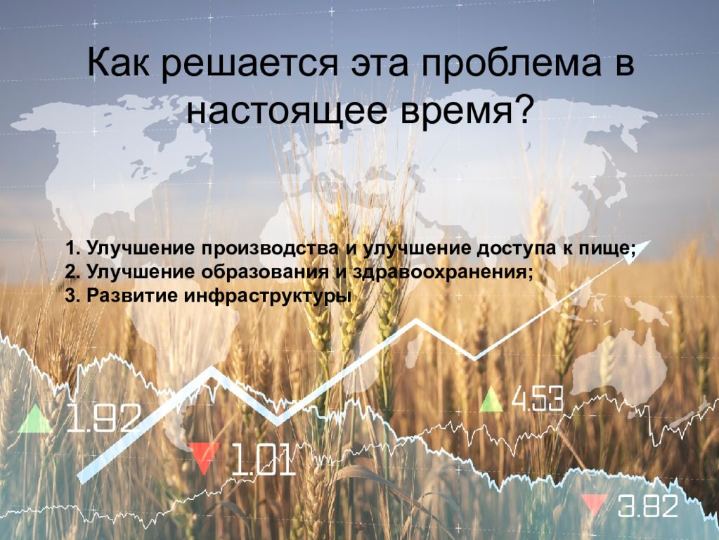 Как решается эта проблема в настоящее время? 1. Улучшение производства и улучшение доступа к пище; 2. Улучшение образования и здравоохранения; 3. Развитие инфраструктуры