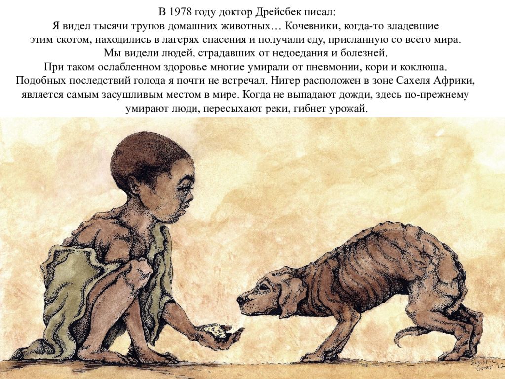 В 1978 году доктор Дрейсбек писал : Я видел тысячи трупов домашних животных … Кочевники, когда-то владевшие этим скотом, находились в лагерях спасения и получали еду, присланную со всего мира. Мы видели людей, страдавших от недоедания и болезней. При таком ослабленном здоровье многие умирали от пневмонии, кори и коклюша. Подобных последствий голода я почти не встречал. Нигер расположен в зоне Сахеля Африки, является самым засушливым местом в мире. Когда не выпадают дожди, здесь по-прежнему умирают люди, пересыхают реки, гибнет урожай.
