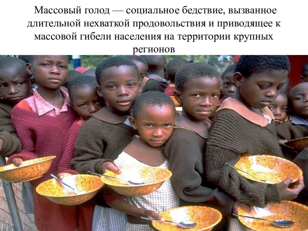 Слайд 4: Массовый голод — социальное бедствие, вызванное длительной нехваткой продовольствия и приводящее к массовой гибели населения на территории крупных регионов