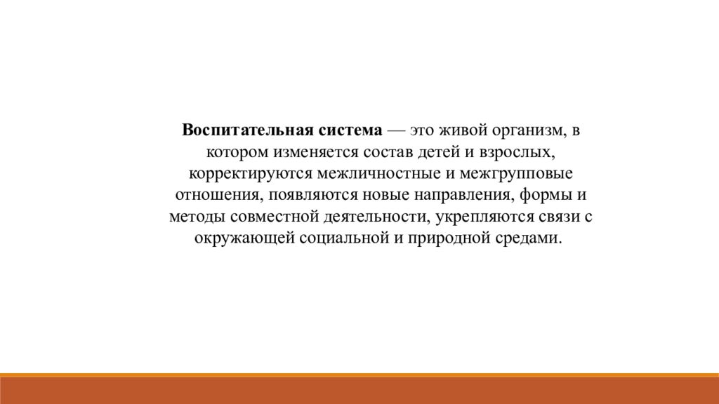 Воспитательная система — это живой организм, в котором изменяется состав детей и взрослых, корректируются межличностные и межгрупповые отношения, появляются новые направления, формы и методы совместной деятельности, укрепляются связи с окружающей социальной и природной средами.