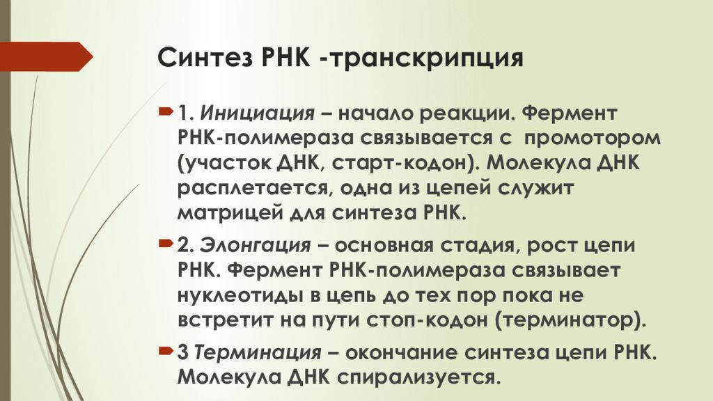 1. Инициация – начало реакции. Фермент РНК-полимераза связывается с промотором (участок ДНК, старт-кодон). Молекула ДНК расплетается, одна из цепей служит матрицей для синтеза РНК. 2. Элонгация – основная стадия, рост цепи РНК. Фермент РНК-полимераза связывает нуклеотиды в цепь до тех пор пока не встретит на пути стоп-кодон (терминатор). 3 Терминация – окончание синтеза цепи РНК. Молекула ДНК спирализуется.