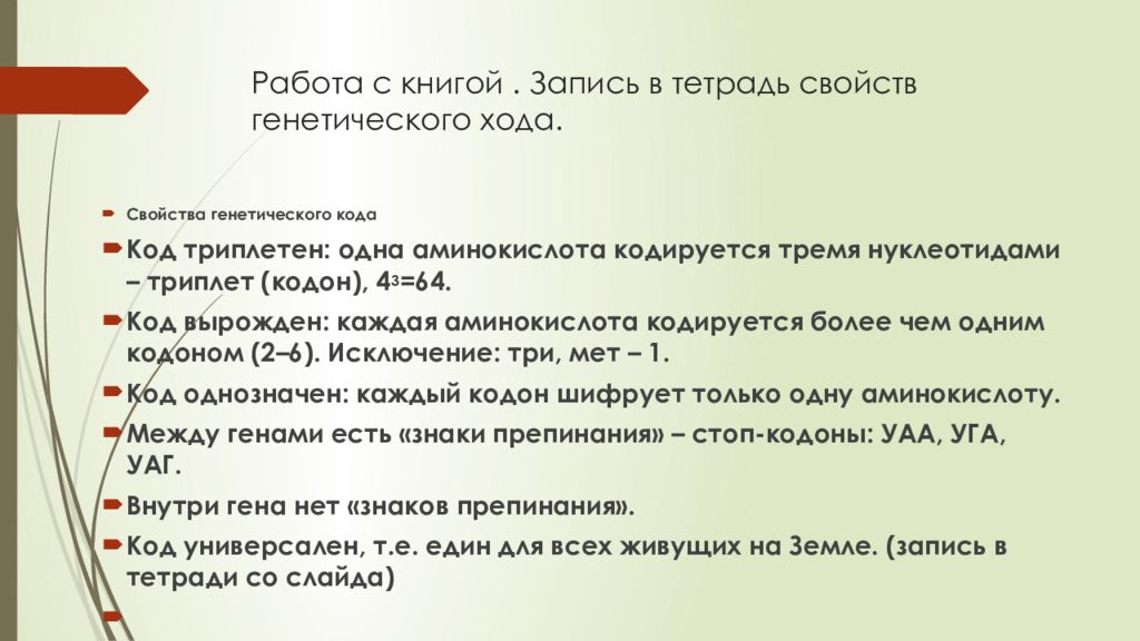 Слайд 6: Работа с книгой. Запись в тетрадь свойств генетического хода