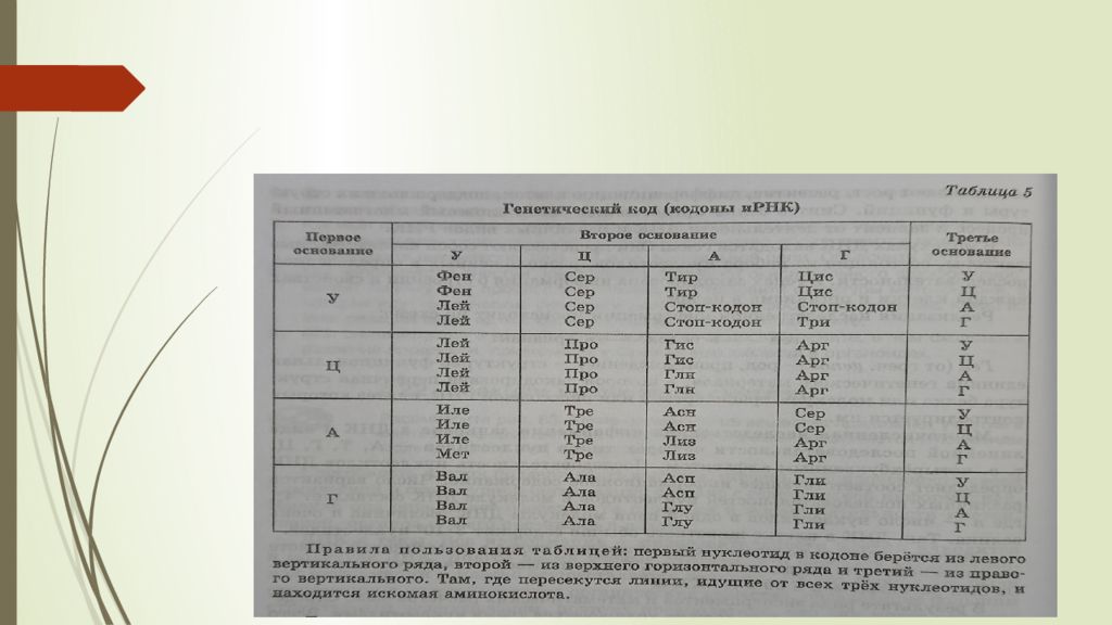 Свойства генетического кода Код триплетен : одна аминокислота кодируется тремя нуклеотидами – триплет (кодон), 4 3 =64. Код вырожден: каждая аминокислота кодируется более чем одним кодоном (2–6). Исключение: три, мет – 1. Код однозначен: каждый кодон шифрует только одну аминокислоту. Между генами есть «знаки препинания» – стоп-кодоны: УАА, УГА, УАГ. Внутри гена нет «знаков препинания». Код универсален, т.е. един для всех живущих на Земле. (запись в тетради со слайда)