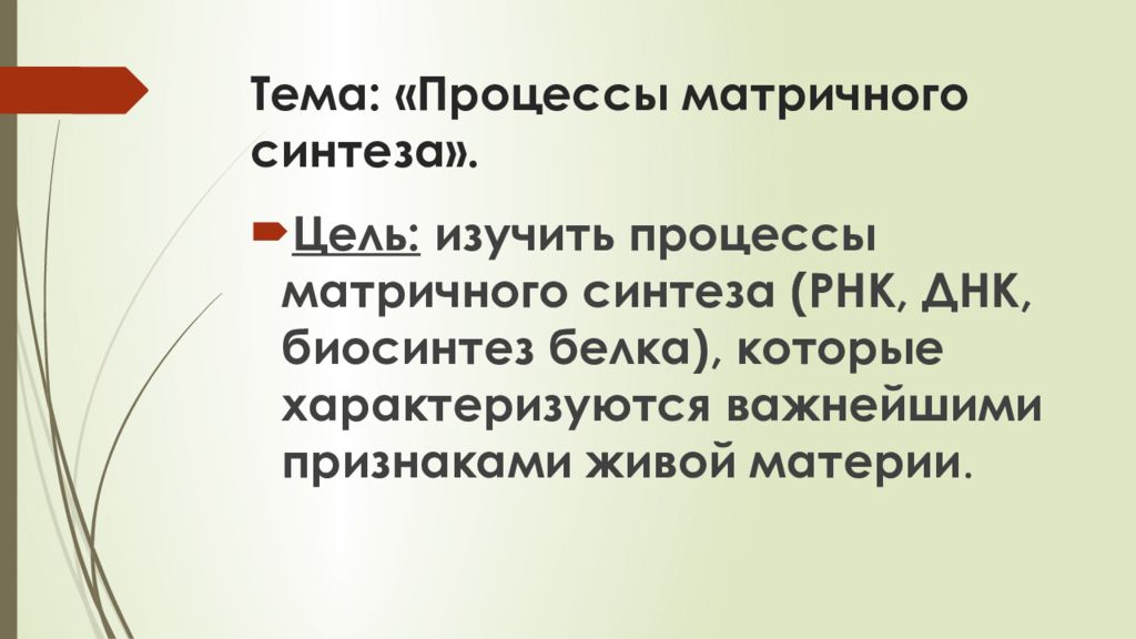 Цель: изучить процессы матричного синтеза (РНК, ДНК, биосинтез белка), которые характеризуются важнейшими признаками живой материи.