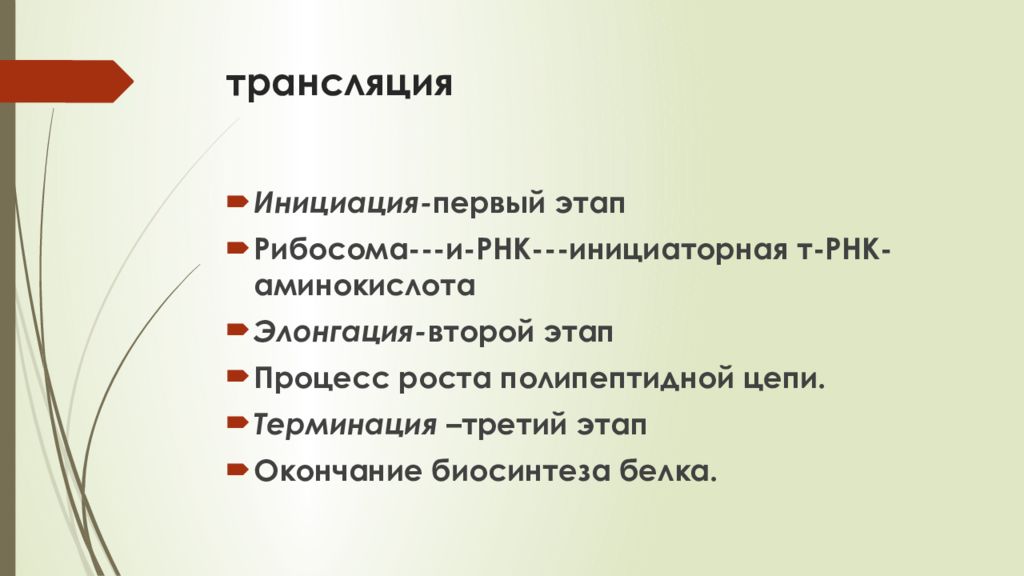 Инициация- первый этап Рибосома---и-РНК--- инициаторная т-РНК-аминокислота Элонгация- второй этап Процесс роста полипептидной цепи. Терминация – третий этап Окончание биосинтеза белка.