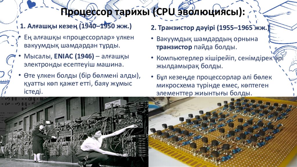 1. Алғашқы кезең (1940–1950 жж.) Ең алғашқы « процессорлар » үлкен вакуумдық шамдардан тұрды. Мысалы, ENIAC (1946) – алғашқы электронды есептеуіш машина. Өте үлкен болды ( бір бөлмені алды ), қуатты көп қажет етті, баяу жұмыс істеді. 2. Транзистор дәуірі (1955–1965 жж.) Вакуумдық шамдардың орнына транзистор пайда болды. Компьютерлер кішірейіп, сенімдірек әрі жылдамырақ болды. Бұл кезеңде процессорлар әлі бөлек микросхема түрінде емес, көптеген элементтер жиынтығы болды. Процессор тарихы ( CPU эволюциясы ):