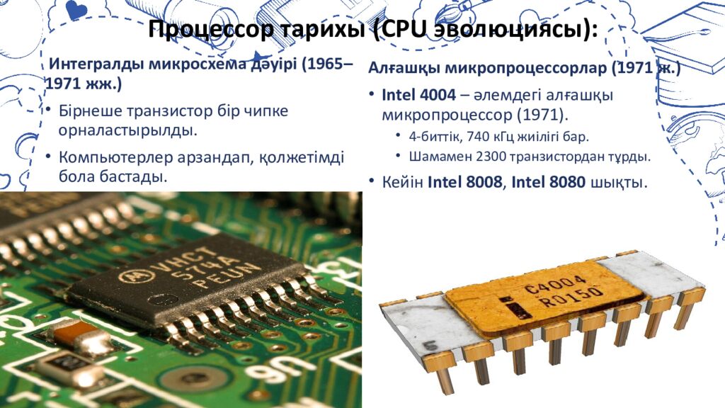 Интегралды микросхема дәуірі (1965–1971 жж.) Бірнеше транзистор бір чипке орналастырылды. Компьютерлер арзандап, қолжетімді бола бастады. Алғашқы микропроцессорлар (1971 ж.) Intel 4004 – әлемдегі алғашқы микропроцессор (1971). 4-биттік, 740 кГц жиілігі бар. Шамамен 2300 транзистордан тұрды. Кейін Intel 8008, Intel 8080 шықты. Процессор тарихы ( CPU эволюциясы ):