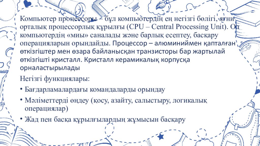Компьютер процессоры – бұл компьютердің ең негізгі бөлігі, яғни орталық процессорлық құрылғы ( CPU – Central Processing Unit). Ол компьютердің « миы » саналады және барлық есептеу, басқару операцияларын орындайды. Процессор – алюминиймен қапталған өткізгіштер мен өзара байланысқан транзисторы бар жартылай өткізгішті кристалл. Кристалл керамикалық корпусқа орналастырылады Негізгі функциялары : Бағдарламалардағы командаларды орындау Мәліметтерді өңдеу ( қосу, азайту, салыстыру, логикалық операциялар ) Жад пен басқа құрылғылардың жұмысын басқару