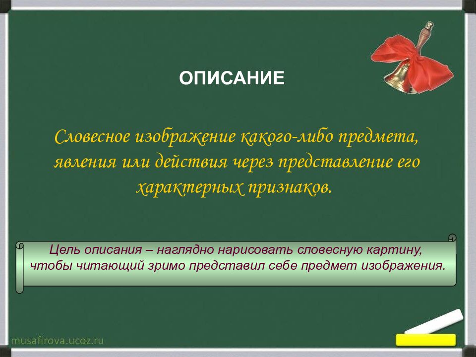 Словесное изображение какого-либо предмета, явления или действия через представление его характерных признаков. ОПИСАНИЕ Цель описания – наглядно нарисовать словесную картину, чтобы читающий зримо представил себе предмет изображения.