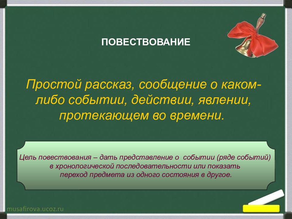 Простой рассказ, сообщение о каком-либо событии, действии, явлении, протекающем во времени. ПОВЕСТВОВАНИЕ Цель повествования – дать представление о событии (ряде событий) в хронологической последовательности или показать переход предмета из одного состояния в другое.
