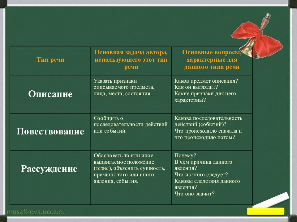 Тип речи Основная задача автора, использующего этот тип речи Основные вопросы, характерные для данного типа речи Описание Указать признаки описываемого предмета, лица, места, состояния. Каков предмет описания? Как он выглядит? Какие признаки для него характерны? Повествование Сообщить о последовательности действий или событий. Какова последовательность действий (событий)? Что происходило сначала и что происходило потом? Рассуждение Обосновать то или иное выдвигаемое положение (тезис), объяснить сущность, причины того или иного явления, события. Почему? В чем причина данного явления? Что из этого следует? Каковы следствия данного явления? Что оно значит?