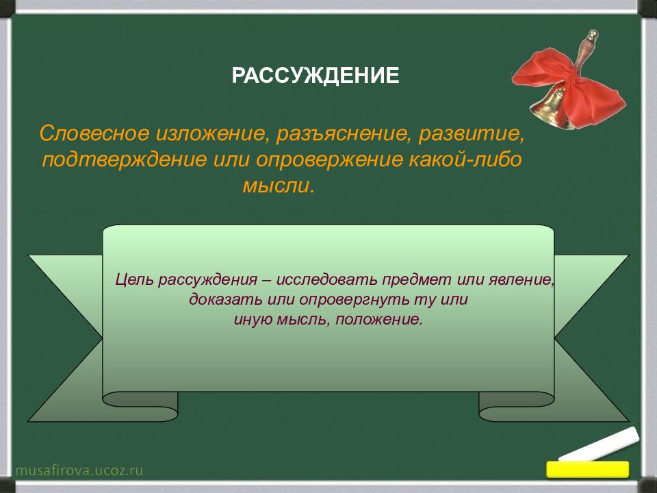 Словесное изложение, разъяснение, развитие, подтверждение или опровержение какой-либо мысли. РАССУЖДЕНИЕ Цель рассуждения – исследовать предмет или явление, доказать или опровергнуть ту или иную мысль, положение.