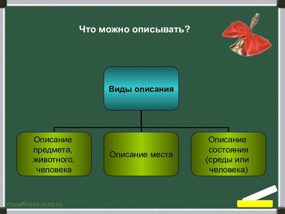 Что можно описывать? Виды описания Описание предмета, животного, человека Описание места Описание состояния (среды или человека)