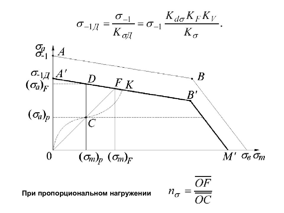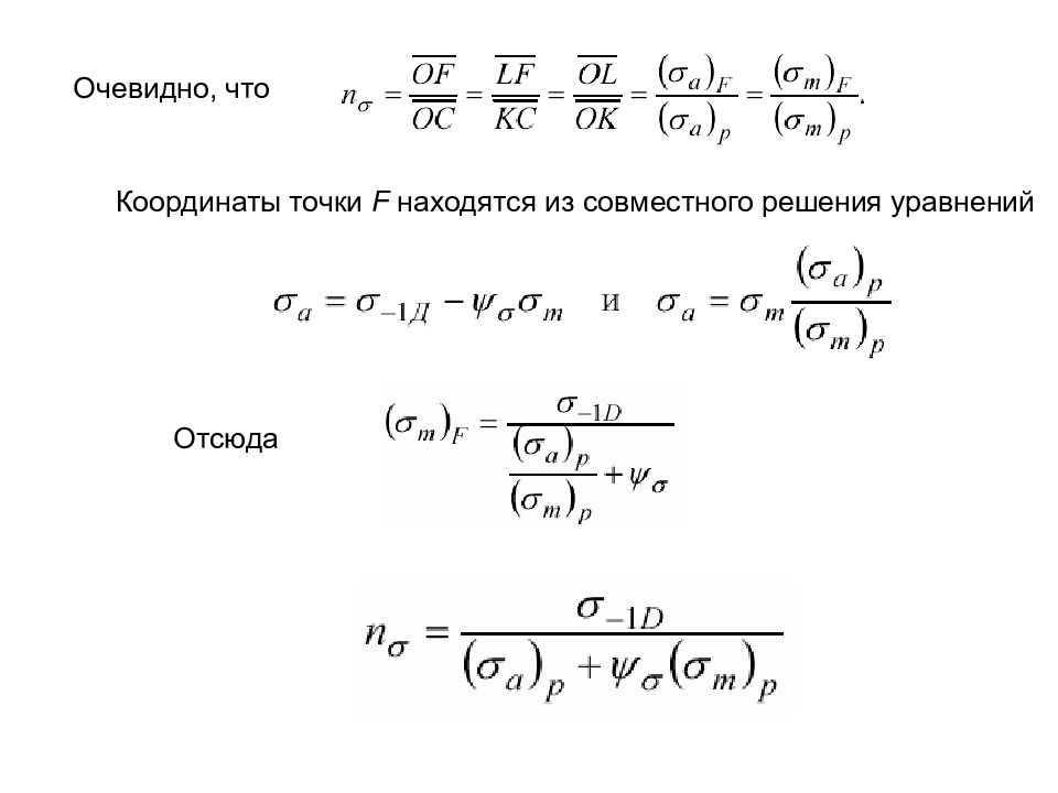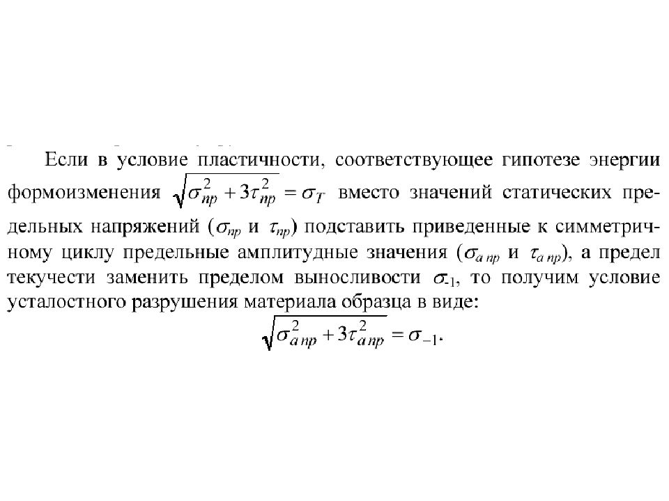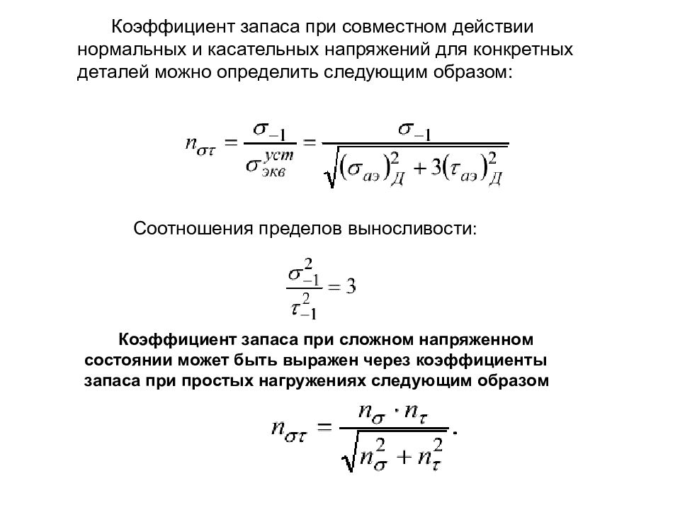 Коэффициент запаса при совместном действии нормальных и касательных напряжений для конкретных деталей можно определить следующим образом: Соотношения пределов выносливости : Коэффициент запаса при сложном напряженном состоянии может быть выражен через коэффициенты запаса при простых нагружениях следующим образом