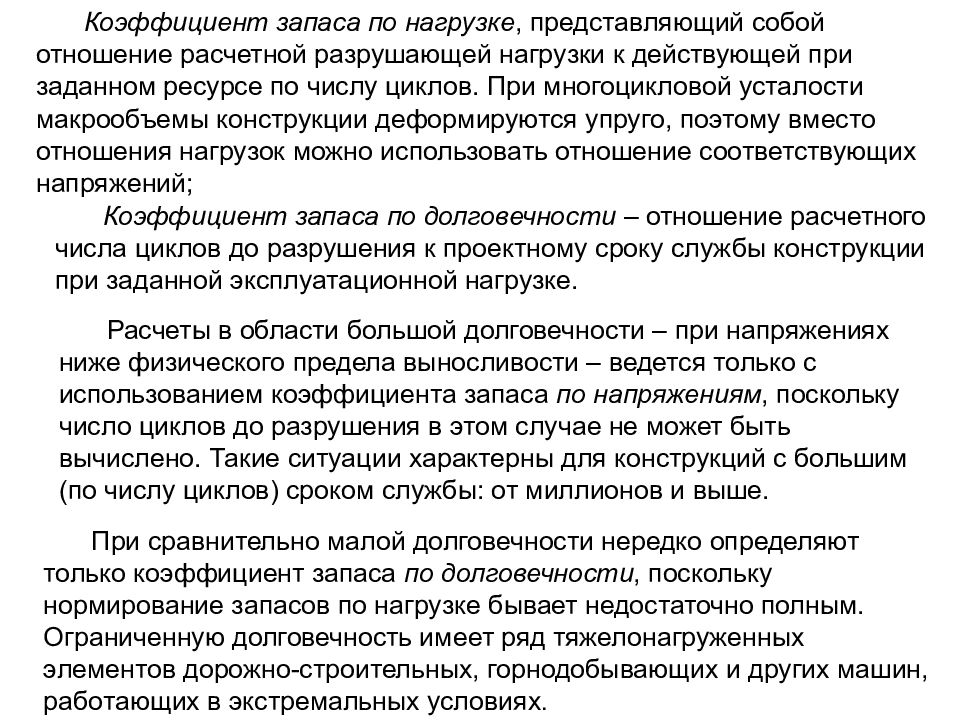 Коэффициент запаса по нагрузке, представляющий собой отношение расчетной разрушающей нагрузки к действующей при заданном ресурсе по числу циклов. При многоцикловой усталости макрообъемы конструкции деформируются упруго, поэтому вместо отношения нагрузок можно использовать отношение соответствующих напряжений; Коэффициент запаса по долговечности – отношение расчетного числа циклов до разрушения к проектному сроку службы конструкции при заданной эксплуатационной нагрузке. Расчеты в области большой долговечности – при напряжениях ниже физического предела выносливости – ведется только с использованием коэффициента запаса по напряжениям, поскольку число циклов до разрушения в этом случае не может быть вычислено. Такие ситуации характерны для конструкций с большим (по числу циклов) сроком службы: от миллионов и выше. При сравнительно малой долговечности нередко определяют только коэффициент запаса по долговечности, поскольку нормирование запасов по нагрузке бывает недостаточно полным. Ограниченную долговечность имеет ряд тяжелонагруженных элементов дорожно-строительных, горнодобывающих и других машин, работающих в экстремальных условиях.