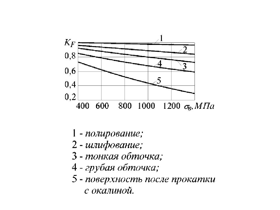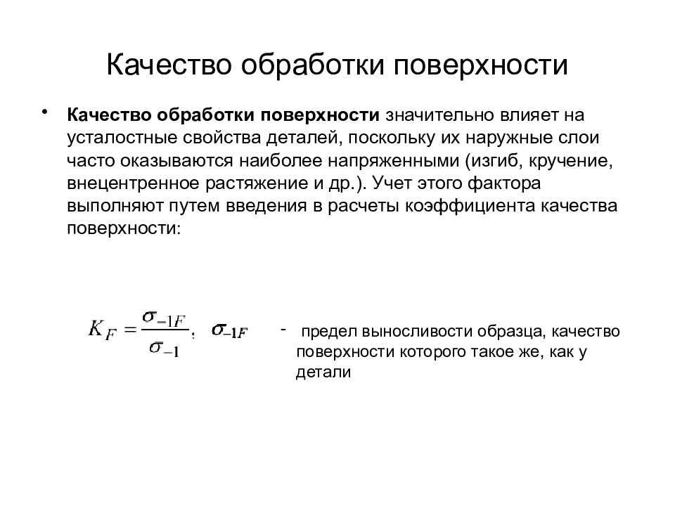 Качество обработки поверхности значительно влияет на усталостные свойства деталей, поскольку их наружные слои часто оказываются наиболее напряженными (изгиб, кручение, внецентренное растяжение и др.). Учет этого фактора выполняют путем введения в расчеты коэффициента качества поверхности : предел выносливости образца, качество поверхности которого такое же, как у детали