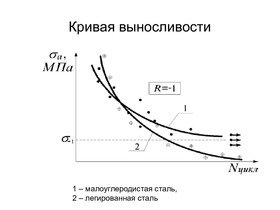 При усталостных испытаниях характеристикой выносливости конкретного материала становится зависимость амплитудного напряжения от числа циклов. Для определения этой зависимости необходимо испытать партию (минимум 10…15 штук) одинаковых образцов из исследуемой марки стали или сплава, т.е. образцов из одной партии (плавки), с одинаковыми размерами, термообработкой, качеством поверхности. Первый образец испытывают при наибольшей амплитуде напряжений, составляющей (0,6…0,75), а последующие при снижающихся амплитудах.