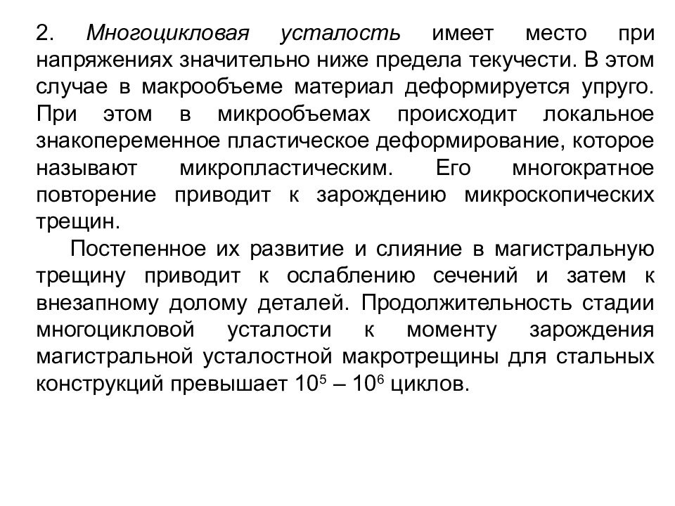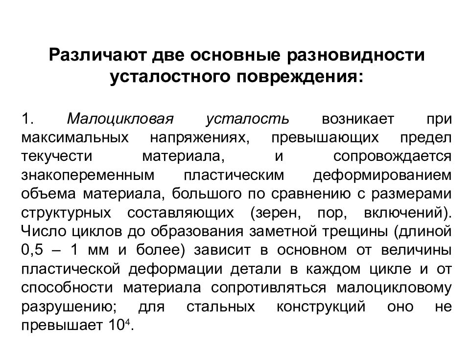 Различают две основные разновидности усталостного повреждения: 1. Малоцикловая усталость возникает при максимальных напряжениях, превышающих предел текучести материала, и сопровождается знакопеременным пластическим деформированием объема материала, большого по сравнению с размерами структурных составляющих (зерен, пор, включений). Число циклов до образования заметной трещины (длиной 0,5 – 1 мм и более) зависит в основном от величины пластической деформации детали в каждом цикле и от способности материала сопротивляться малоцикловому разрушению; для стальных конструкций оно не превышает 10 4.