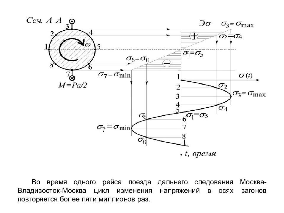 Во время одного рейса поезда дальнего следования Москва-Владивосток-Москва цикл изменения напряжений в осях вагонов повторяется более пяти миллионов раз.