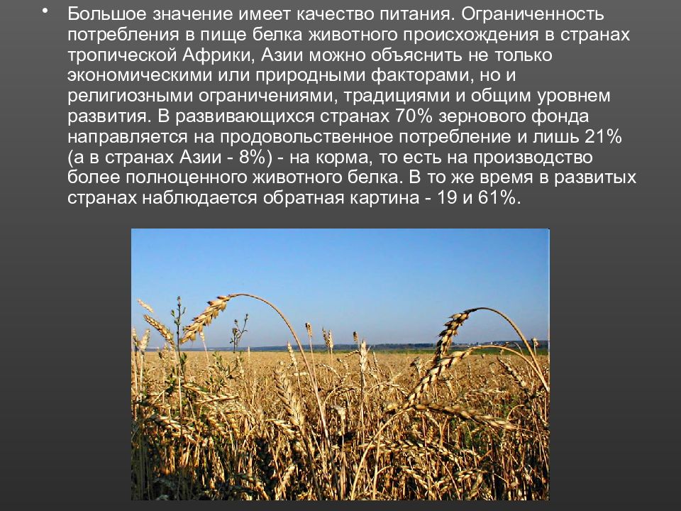 Большое значение имеет качество питания. Ограниченность потребления в пище белка животного происхождения в странах тропической Африки, Азии можно объяснить не только экономическими или природными факторами, но и религиозными ограничениями, традициями и общим уровнем развития. В развивающихся странах 70% зернового фонда направляется на продовольственное потребление и лишь 21% (а в странах Азии - 8%) - на корма, то есть на производство более полноценного животного белка. В то же время в развитых странах наблюдается обратная картина - 19 и 61%.