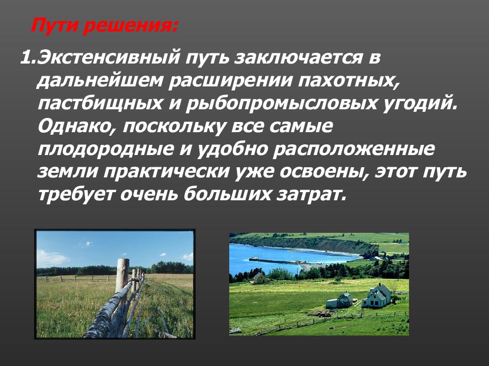 Пути решения: Экстенсивный путь заключается в дальнейшем расширении пахотных, пастбищных и рыбопромысловых угодий. Однако, поскольку все самые плодородные и удобно расположенные земли практически уже освоены, этот путь требует очень больших затрат.