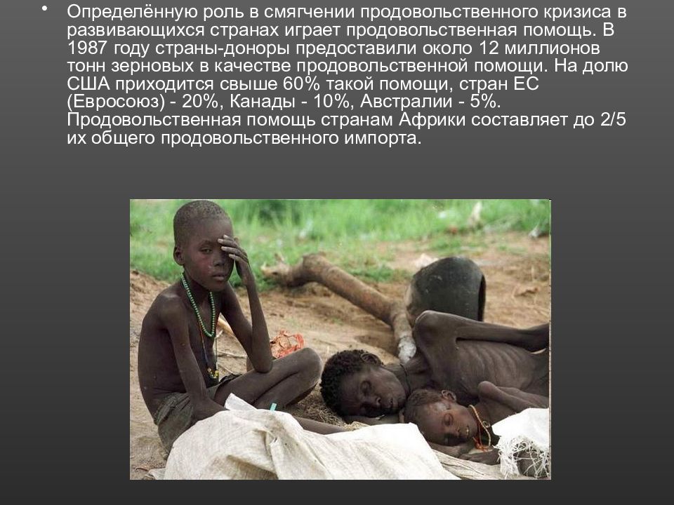 Определённую роль в смягчении продовольственного кризиса в развивающихся странах играет продовольственная помощь. В 1987 году страны-доноры предоставили около 12 миллионов тонн зерновых в качестве продовольственной помощи. На долю США приходится свыше 60% такой помощи, стран ЕС (Евросоюз) - 20%, Канады - 10%, Австралии - 5%. Продовольственная помощь странам Африки составляет до 2/5 их общего продовольственного импорта.