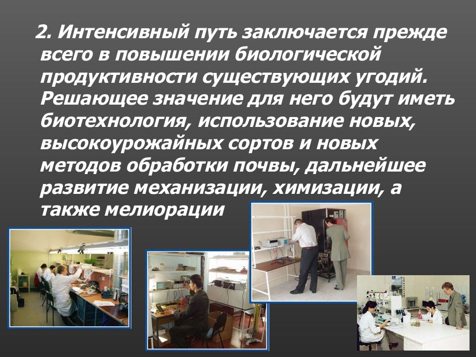 2. Интенсивный путь заключается прежде всего в повышении биологической продуктивности существующих угодий. Решающее значение для него будут иметь биотехнология, использование новых, высокоурожайных сортов и новых методов обработки почвы, дальнейшее развитие механизации, химизации, а также мелиорации .