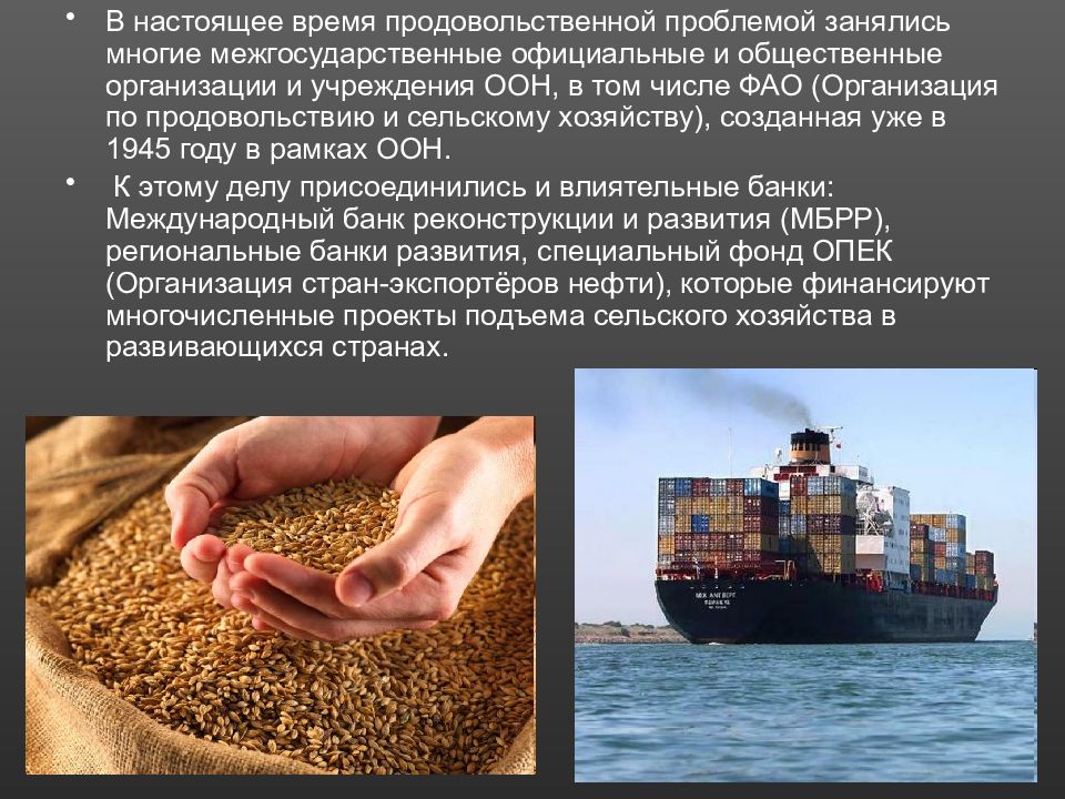 В настоящее время продовольственной проблемой занялись многие межгосударственные официальные и общественные организации и учреждения ООН, в том числе ФАО (Организация по продовольствию и сельскому хозяйству), созданная уже в 1945 году в рамках ООН. К этому делу присоединились и влиятельные банки: Международный банк реконструкции и развития (МБРР), региональные банки развития, специальный фонд ОПЕК (Организация стран-экспортёров нефти), которые финансируют многочисленные проекты подъема сельского хозяйства в развивающихся странах.