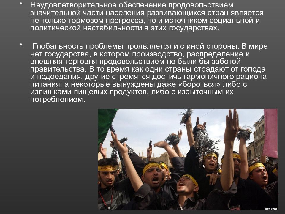 Неудовлетворительное обеспечение продовольствием значительной части населения развивающихся стран является не только тормозом прогресса, но и источником социальной и политической нестабильности в этих государствах. Глобальность проблемы проявляется и с иной стороны. В мире нет государства, в котором производство, распределение и внешняя торговля продовольствием не были бы заботой правительства. В то время как одни страны страдают от голода и недоедания, другие стремятся достичь гармоничного рациона питания; а некоторые вынуждены даже «бороться» либо с излишками пищевых продуктов, либо с избыточным их потреблением.