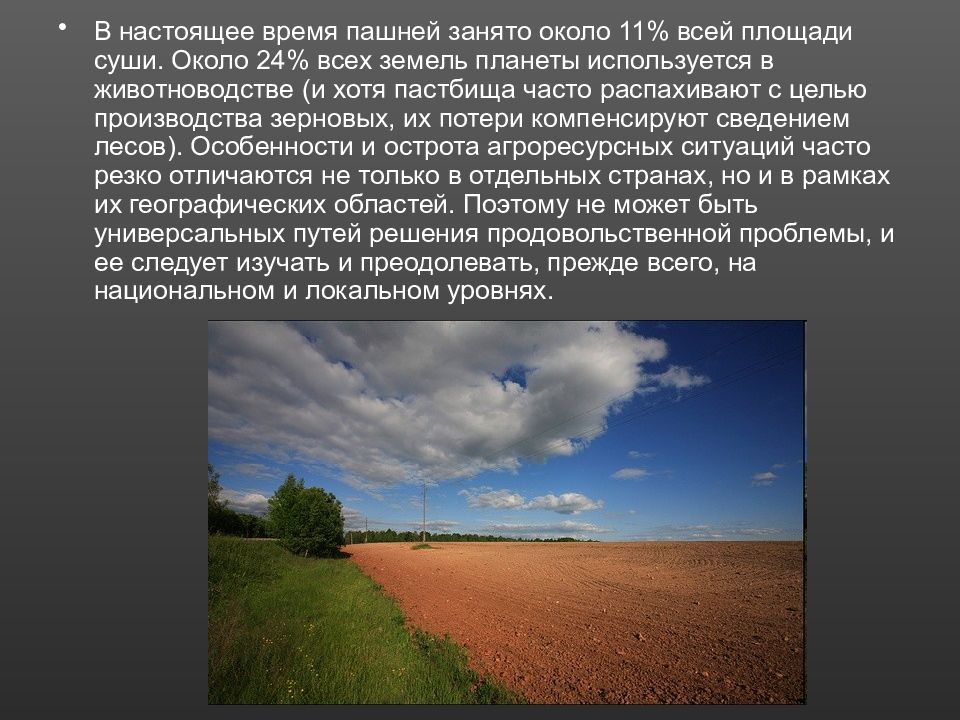 В настоящее время пашней занято около 11% всей площади суши. Около 24% всех земель планеты используется в животноводстве (и хотя пастбища часто распахивают с целью производства зерновых, их потери компенсируют сведением лесов). Особенности и острота агроресурсных ситуаций часто резко отличаются не только в отдельных странах, но и в рамках их географических областей. Поэтому не может быть универсальных путей решения продовольственной проблемы, и ее следует изучать и преодолевать, прежде всего, на национальном и локальном уровнях.