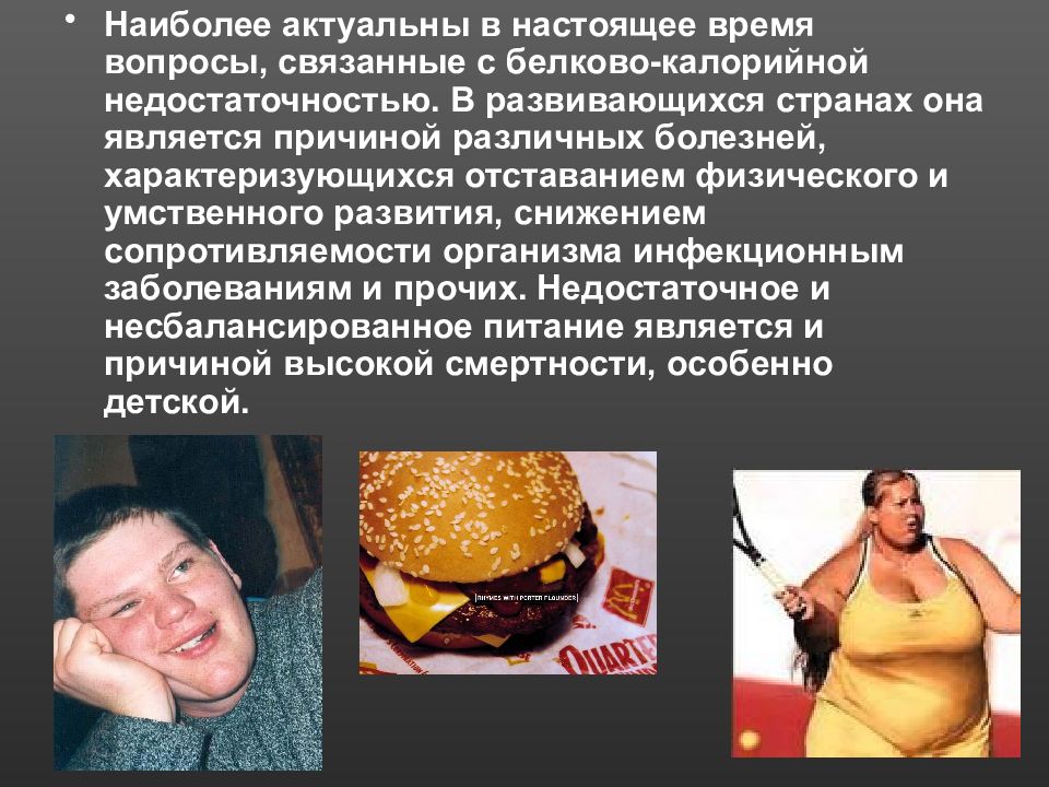 Наиболее актуальны в настоящее время вопросы, связанные с белково-калорийной недостаточностью. В развивающихся странах она является причиной различных болезней, характеризующихся отставанием физического и умственного развития, снижением сопротивляемости организма инфекционным заболеваниям и прочих. Недостаточное и несбалансированное питание является и причиной высокой смертности, особенно детской.