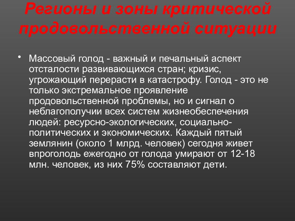 Массовый голод - важный и печальный аспект отсталости развивающихся стран; кризис, угрожающий перерасти в катастрофу. Голод - это не только экстремальное проявление продовольственной проблемы, но и сигнал о неблагополучии всех систем жизнеобеспечения людей: ресурсно-экологических, социально-политических и экономических. Каждый пятый землянин (около 1 млрд. человек) сегодня живет впроголодь ежегодно от голода умирают от 12-18 млн. человек, из них 75% составляют дети.