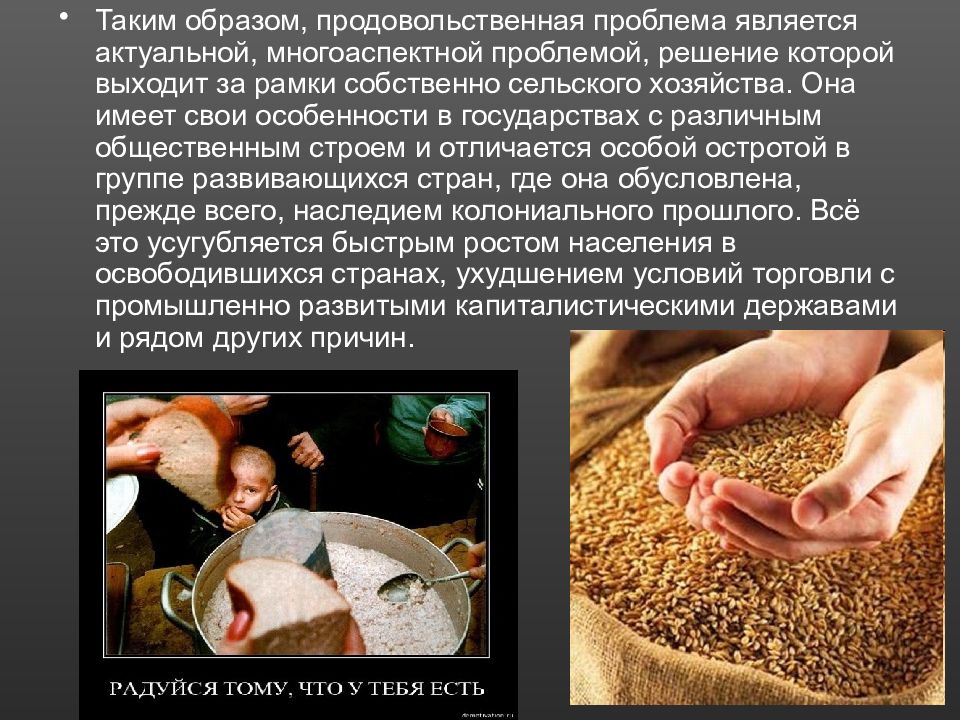 Таким образом, продовольственная проблема является актуальной, многоаспектной проблемой, решение которой выходит за рамки собственно сельского хозяйства. Она имеет свои особенности в государствах с различным общественным строем и отличается особой остротой в группе развивающихся стран, где она обусловлена, прежде всего, наследием колониального прошлого. Всё это усугубляется быстрым ростом населения в освободившихся странах, ухудшением условий торговли с промышленно развитыми капиталистическими державами и рядом других причин.